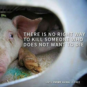 للحيوانات حياة اجتماعية ونفسية معقدة، ولها عائلات، وتشعر بالألم كما يشعر به البشر. يُقتل أكثر من 27 مليار حيوان سنويًا في الولايات المتحدة وحدها بطرق مروعة من شأنها أن تُرعب أي شخص رحيم. هؤلاء الأفراد هم سكان كوكب الأرض. إنهم يستحقون حقوقًا، ومكانًا على الطاولة، وألا يُتركوا خلف الركب. إنهم ضحايا الاستغلال والقتل وانقراض الأنواع وتدمير الموائل. هؤلاء الأفراد غير البشر التعساء مسجونون ظلماً في ظروف مروعة مليئة بالأمراض، ويتعرضون للتشويه والانتهاك والاغتصاب واختطاف أطفالهم، وفي النهاية يُقتلون بوحشية، وعادةً ما يكونون في كامل وعيهم، وكل ذلك لإرضاء نزوات أصحاب السلطة – البشر، الذين يجعلون أنفسهم والكوكب غير صحيين بشكل متزايد في هذه العملية. لن ينعم الجنس البشري بالسلام أو الأمان بينما يستمر في استغلال الأنواع الأخرى.