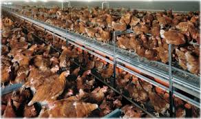 Les œufs sont produits par de grandes entreprises agroalimentaires. Les poules sont élevées en batterie dans des cages surpeuplées où leurs instincts les plus élémentaires sont cruellement bafoués. Il n’y a pas de lumière naturelle. Quatre ou cinq poules vivent dans chaque cage. Elles ne peuvent ni marcher ni déployer leurs ailes. Leurs plumes tombent, leur peau devient à vif et souvent ensanglantée, et leurs pattes sont blessées et souvent coincées par le grillage du sol. Lorsque les pattes de la poule se coincent dans le grillage, cela peut l’empêcher d’atteindre la nourriture. Les poules peuvent mourir de faim à quelques centimètres de la nourriture. Les poules mortes restent dans la cage avec les poules vivantes.